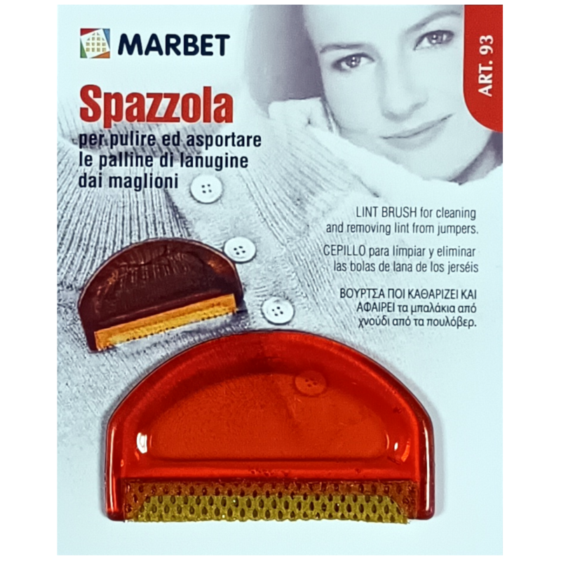 Βουρτσάκι της εταιρίας Marbet, που καθαρίζει και αφαιρεί κόμπους και μπαλάκια από πλεκτά ενδύματα, πουλόβερ, μπλούζες κτλ. Απλώστε το ρούχο σε μια επίπεδη επιφάνεια και βουρτσίστε με ομαλή πίεση.