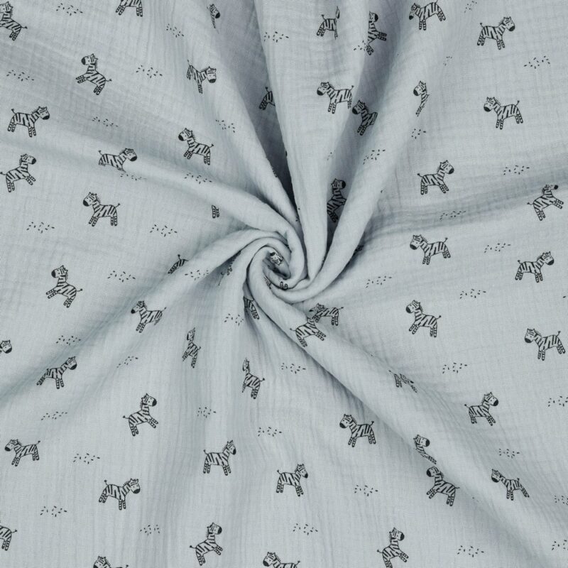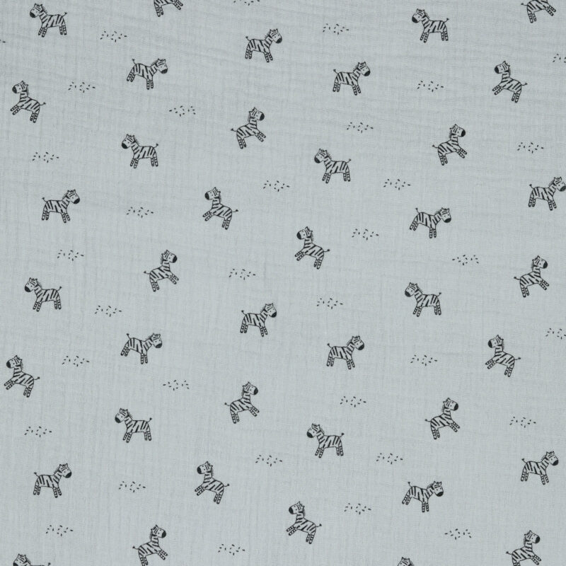 Μουσελίνα βαμβακερή με σχέδιο ζέβρες σε φόντο ανοιχτό γκρι.