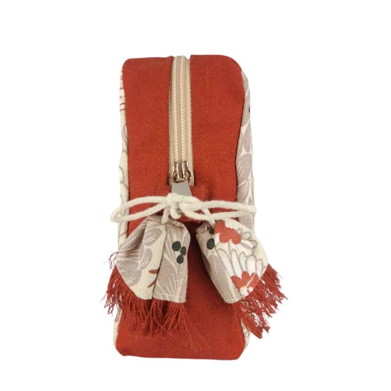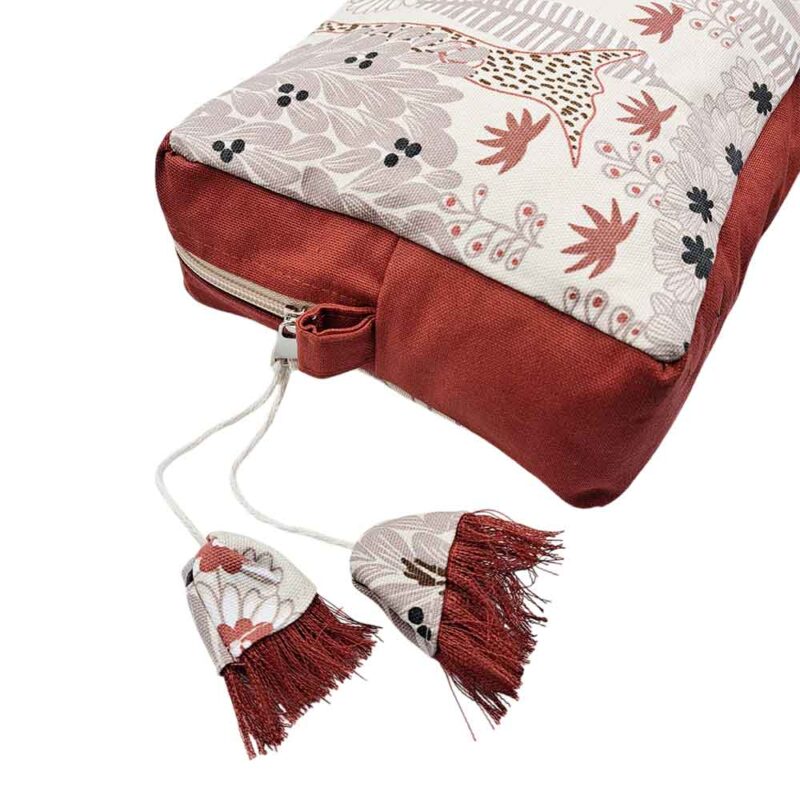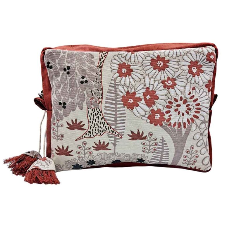 Νεσεσέρ από καμβά ύφασμα σε σχέδιο Tropical, συνδυασμένο με εκάι καμβά ύφασμα. Είναι επενδυμένο με εκρού φόδρα και κλείνει με ασημί φερμουάρ, στο οποίο έχει προστεθεί κορδονάκι με καμπανούλες στο τελείωμα από τα ίδια υφάσματα.
