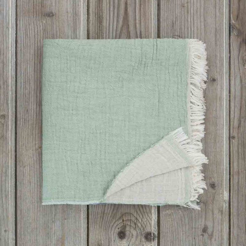 Έχει υπέροχο χρώμα σε αποχρώσεις της μέντας και του εκρού και μπορεί να χρησιμοποιηθεί και από τις δύο της πλευρές. Έχει γκοφρέ ύφανση και εξαιρετικά μαλακή υφή. Τα διακριτικά κρόσσια στο φινίρισμά της ταιριάζουν άψογα με την φυσική της υφή και το στιλ της.
