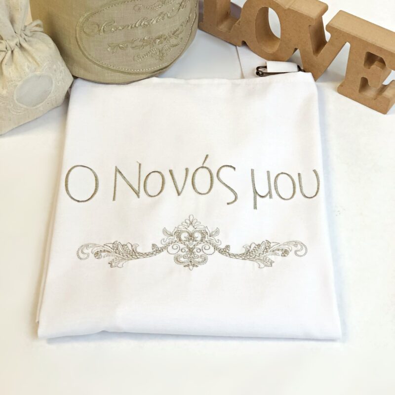 Ποδιά “Ο Νονός μου”- Raison D’être. Λευκή με χακί κέντημα