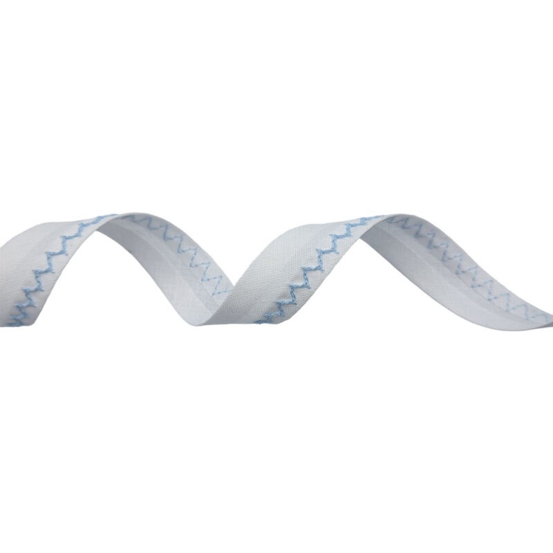 Ρέλι λευκό με διακοσμητική γραμμή κεντήματος γαλάζιου χρώματος, πλάτους 18 χιλιοστών. Διακοσμήστε τα αγαπημένα σας ρούχα, λευκά είδη και ό,τι άλλο επιθυμείτε με αυτό το ρέλι εξαιρετικής ποιότητας.
