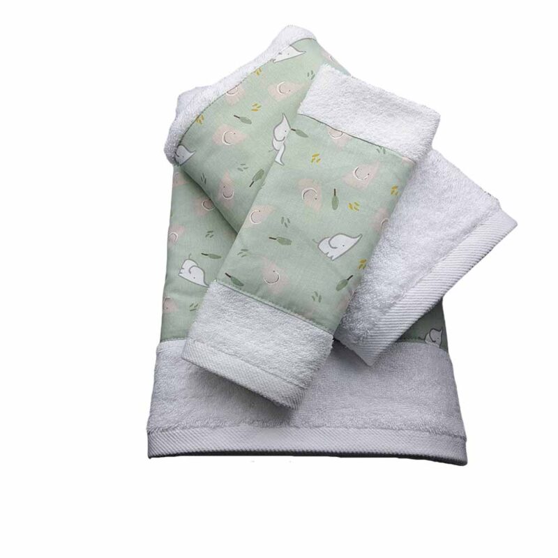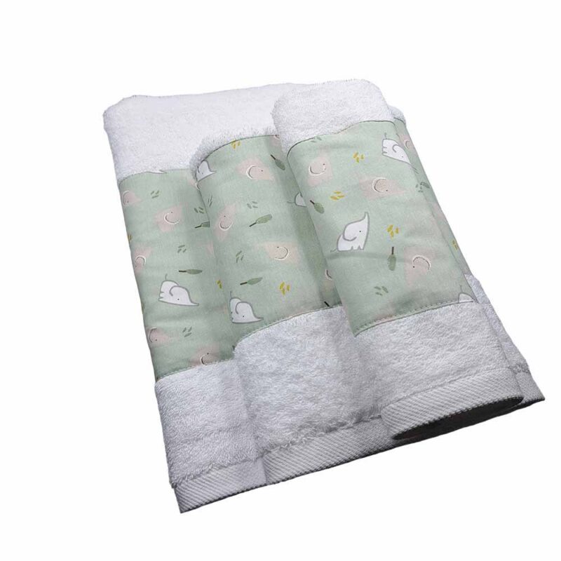 Οι πρώτες πετσετούλες του μωρού, κατασκευασμένες από απορροφητικό βαμβάκι, διακοσμημένες με ύφασμα που απεικονίζει μικρά ελεφαντάκια σε φόντο στο χρώμα της μέντας. Το σετ αποτελείται από 3 πετσέτες, μια μεγάλη πετσέτα μπάνιου με διάσταση 70 cm x 140 cm, μια μεσαία 50 cm x 90 cm και μια μικρή πετσετούλα 30cm x 50cm. Ένα χρήσιμο αξεσουάρ για την καθημερινότητα του μικρού σας και μια ιδανική πρόταση για δώρο.