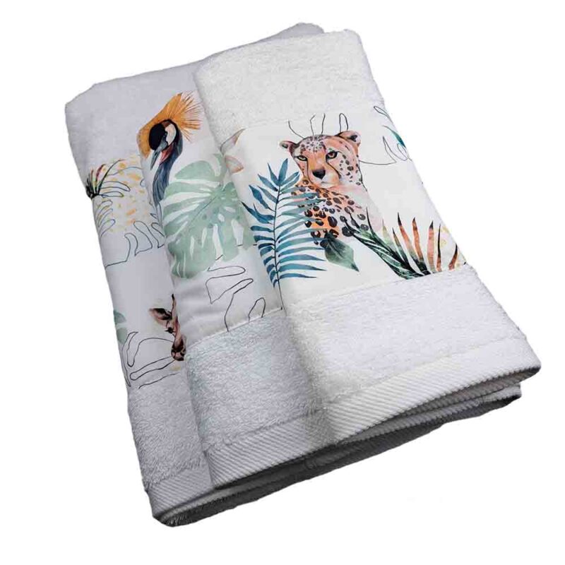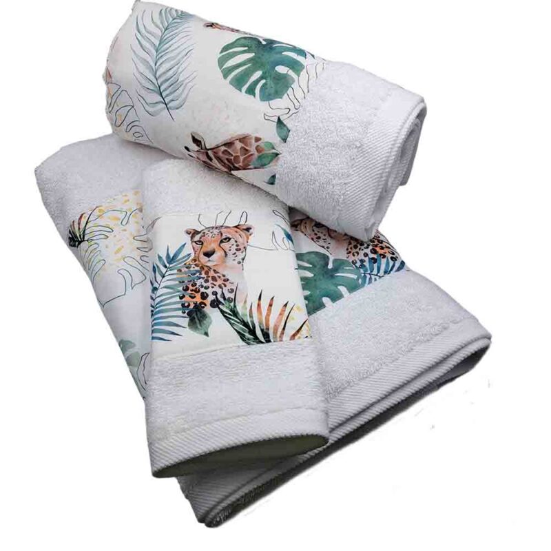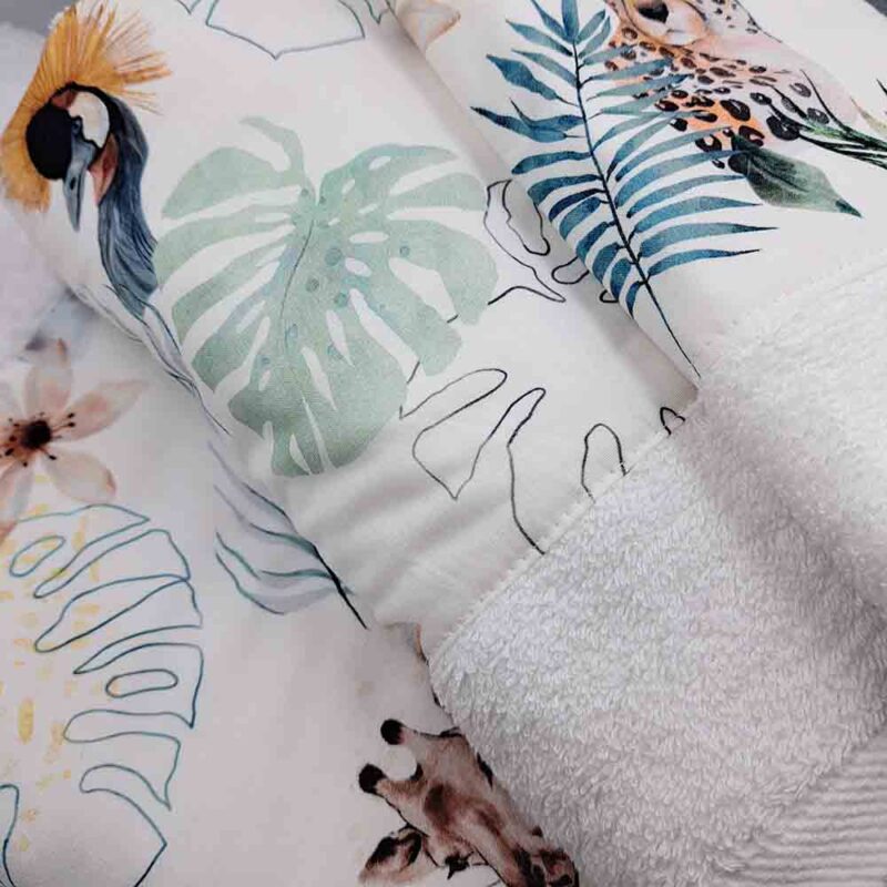 Οι πρώτες πετσετούλες του μωρού, κατασκευασμένες από απορροφητικό βαμβάκι, διακοσμημένες με ύφασμα που απεικονίζει ζώα της ζούγκλας. Το σετ αποτελείται από 3 πετσέτες, μια μεγάλη πετσέτα μπάνιου με διάσταση 70 cm x 140 cm, μια μεσαία 50 cm x 90 cm και μια μικρή πετσετούλα 30cm x 50cm. Ένα χρήσιμο αξεσουάρ για την καθημερινότητα του μικρού σας και μια ιδανική πρόταση για δώρο.