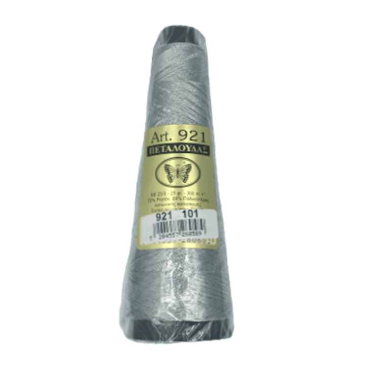 Χρυσοκλωστή Art 921 από την εταιρία ΠΕΤΑΛΟΥΔΑ-ΜΟΥΖΑΚΗΣ. Σε κώνο 25gr ιαπωνικής κατασκευής που συσκευάζεται στην Ελλάδα από την Πεταλούδα. Αποτελείται απο 72% Βισκόζη και 28% Πολυεστέρα