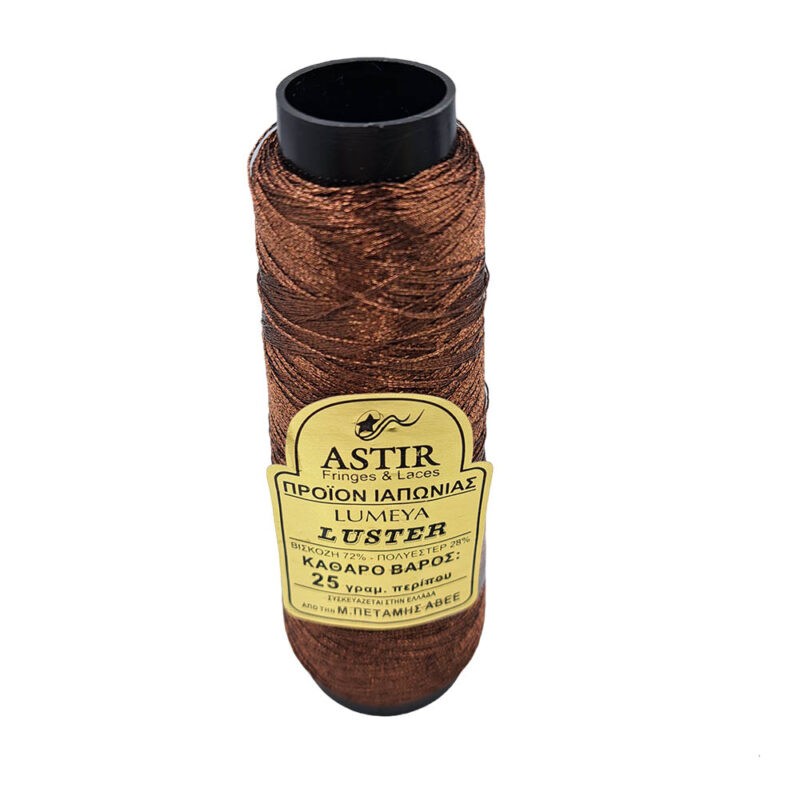 Χρυσοκλωστή Lumeya Luster σε χρώμα μπρονζέ από την εταιρία Astir, σε κώνο 25gr ιαπωνικής παραγωγής που συσκευάζεται στην Ελλάδα. Σύνθεση: 72% Βισκόζη και 28% Πολυεστέρας.